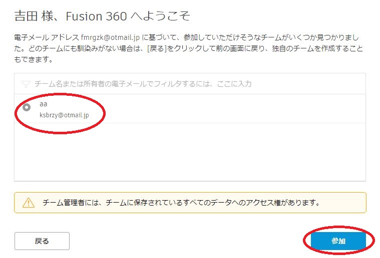 初めての方は迷いますが最初の立ち上げ画面を見たい人はまだ「チームを作成」していないと思いますので「既存のチームに参加」を選びクリックします。