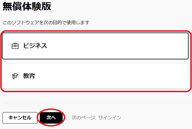 ビジネスで使うのか教育で使うのかどちらかタブをクリックした後に「次へ」を押します。