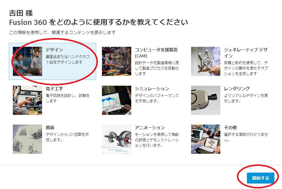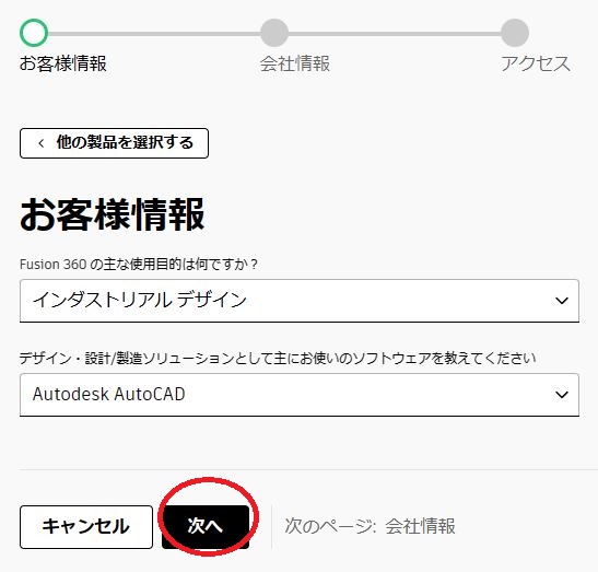 これでアカウントの作成は完了しました。次にお客様情報を続けて入力して行きます。「何のデザインを行うか」と「現在使っているお使いのソフトウェア」を選択し「次へ」をクリック!分からなければ適当なもので大丈夫です。