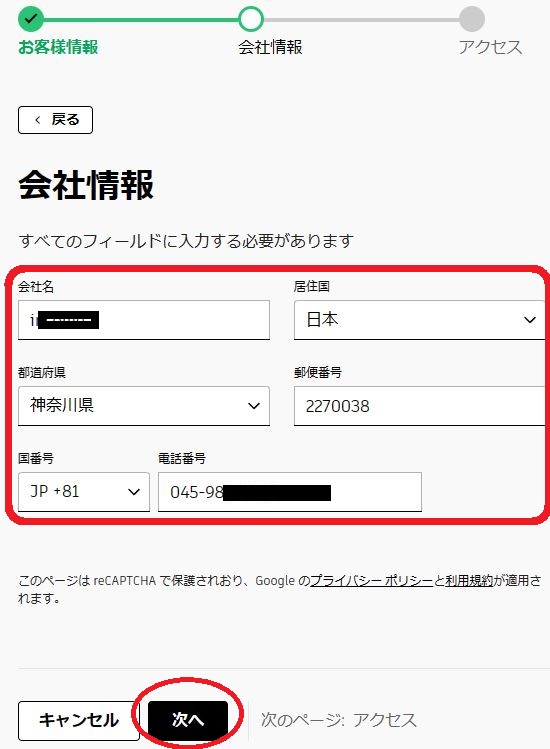 会社名や居住国、お住まいの都道府県、郵便番号、電話番号を記載し「次へ」をクリック。