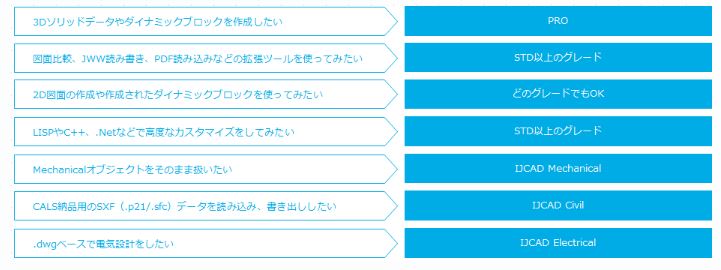 IJCADにはLT、STD、PROの3つのバージョンがあり、バージョンが上がるごとに機能が増加します。