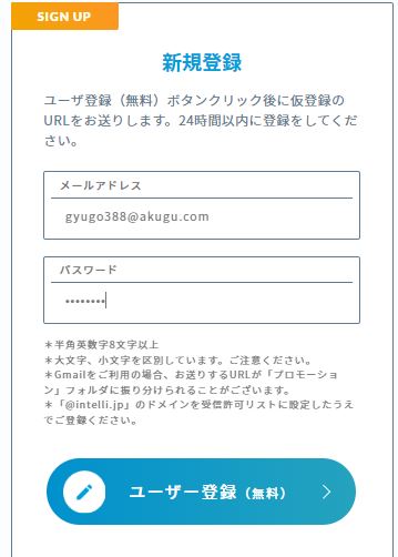 2.ご自身がお持ちのメールアドレスとパスワードを入力します。パスワードは忘れない半角英数字の自分の好きなものを記載してください。